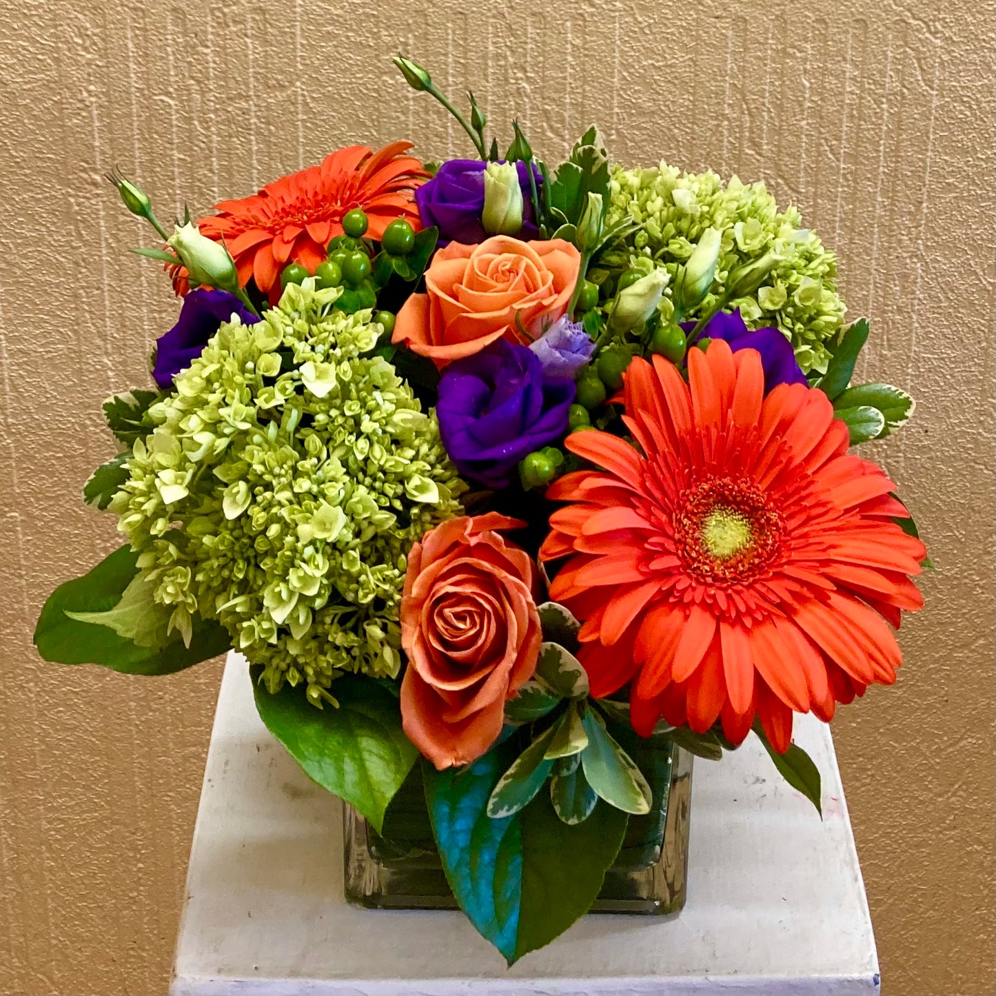 Soyez audacieux avec cet arrangement de vase cubique composé de gerberas et de roses orange vif, de lisianthus violets, d'hortensias verts et de légumes verts.
