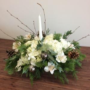Gorgeously evocative of a silent snowfall, this lush candle centerpiece features white alstro and hydrangea, evergreens, seeded eucalyptus, natural accents and a touch of elegant seasonal trim.