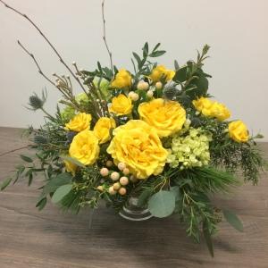 Traditional yet unexpected! This fragrant holiday arrangement combines classic winter greens with jovial yellow roses, green hydrangea, peach hypericum and sea holly, all in a pedestal bowl.
