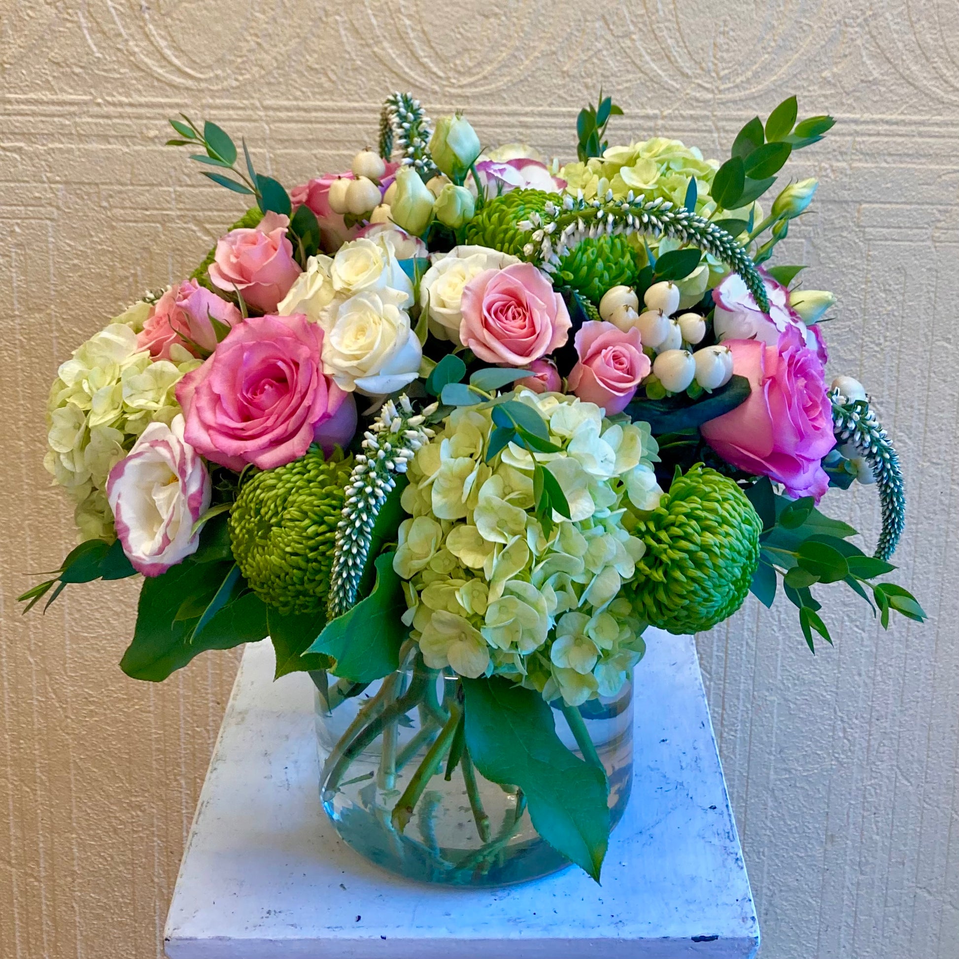 Think hot pink! Vibrant roses and tulips are balanced by white hydrangea and lysianthus in a low container.