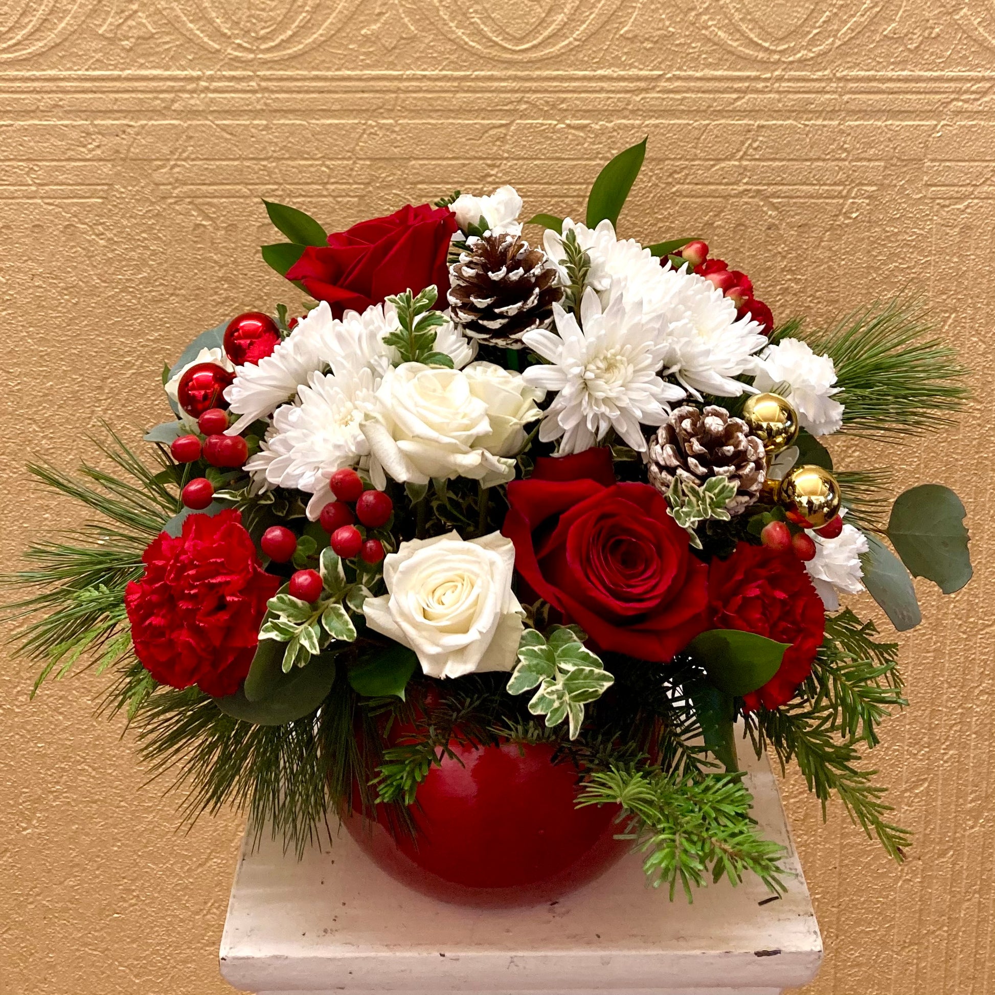 As cozy and playful as a sleigh ride, this combination of red and cream seasonal blooms sit amongst evergreens and festive trim in a keepsake red ceramic bowl.