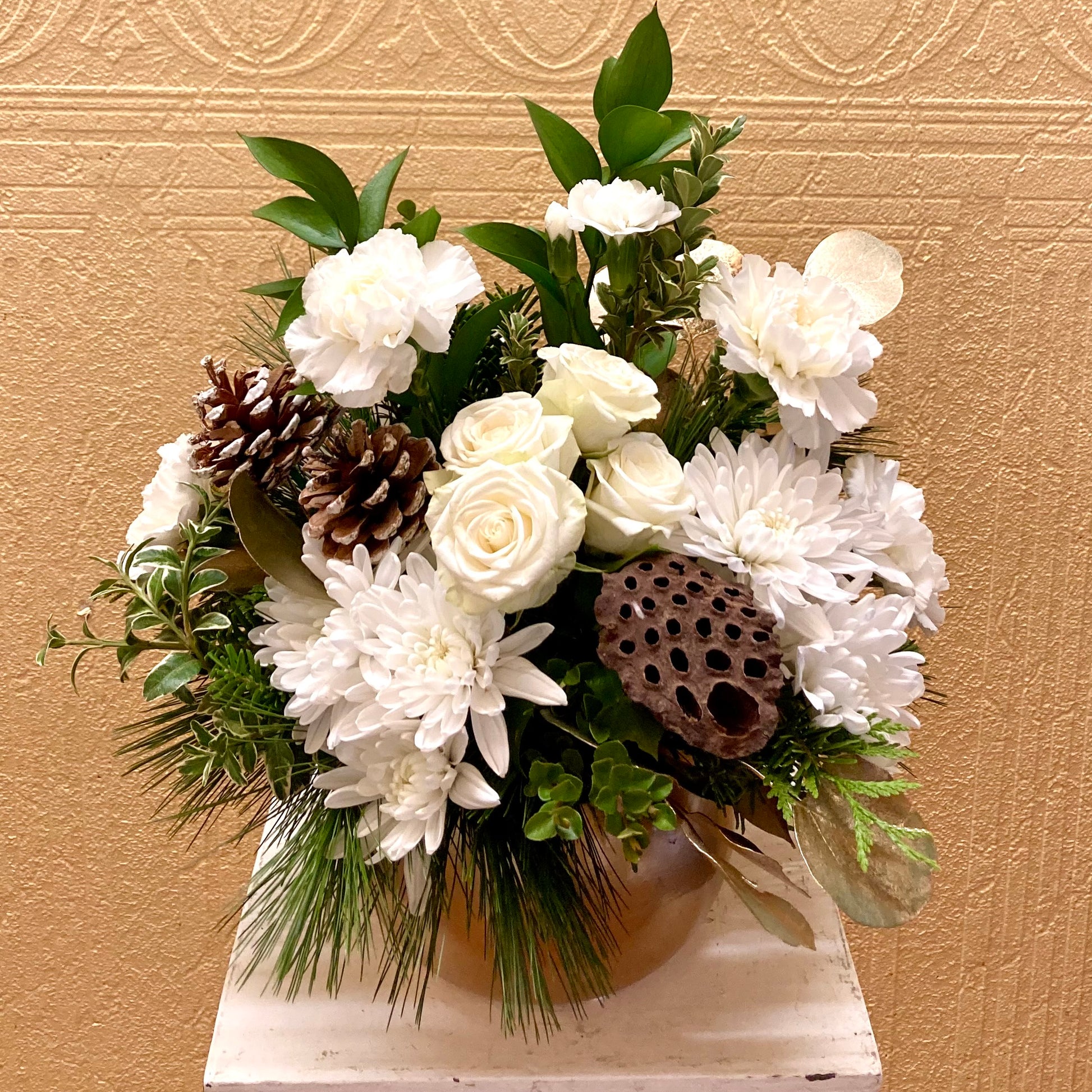 Like a stroll through the forest on a sunny winter afternoon! Warm white blooms are accented with rustic trim and greenery in a keepsake brushed gold ceramic container.